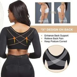 Womens Shapewear 3/4 Sleeve Arm Shaper Front Closure Compression Bra Post Surgery Posture Corrector Tank Top BLACK
