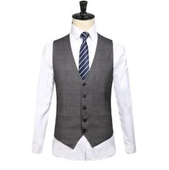 Slim fit v neck suit vest with 2 outer pockets and 4 values fastening. Button and zipper fastening suit pants with 2 side pockets and 2 back pockets