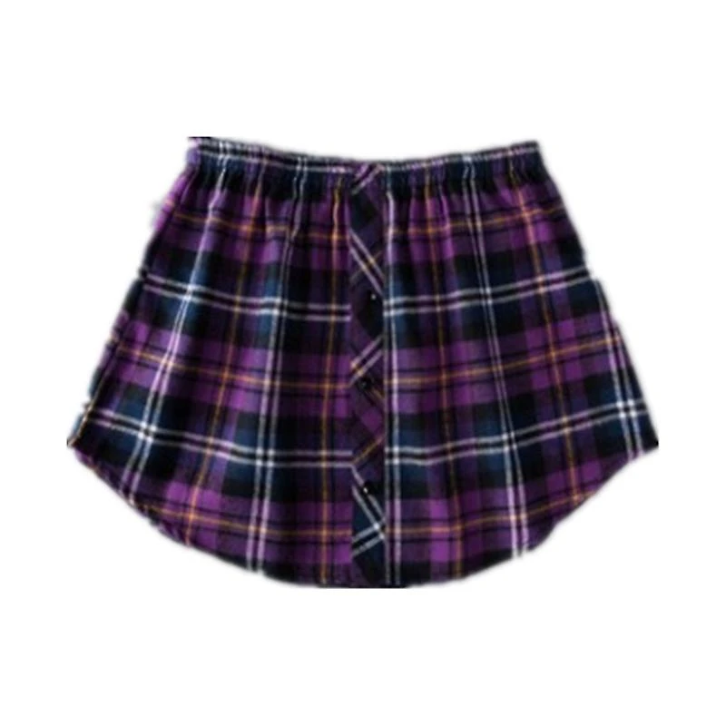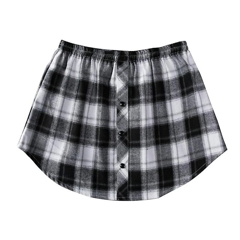 1. Adjustable, low hem, elastic waist, solid colorplaidstrip design, pull on, one-third splitting hemline.
