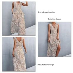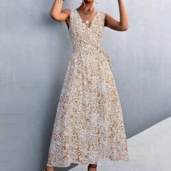 Characteristics: Long length printed dress, V neck, sleeveless design, waist belt and pocket on both sides. Sweet and lovely, soft and charming. Classic quality printed fabric. Very soft, comfortable and breathable.