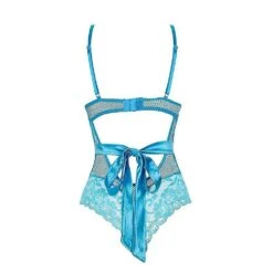 This teddy underwear has lace cups, lace trim, lace front panel, comfortable fit waist belt and bow back closure, scalloped lace trim, adjustable shoulder straps, hook-eye back and cheeky cut bottom.