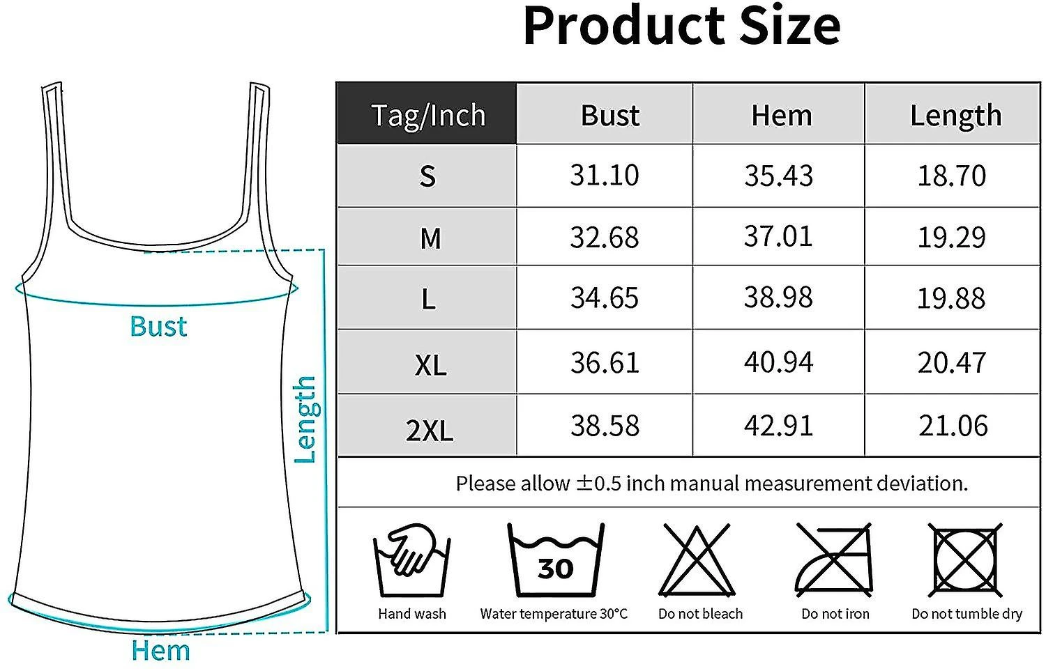 Cotton material: Soft and stretchy cotton fabric and fine sewing craft offers chafe-free comfort.Tank top for all season: Easily matching with shorts, legging, jeans or layering under shirts, coats, jackets, cardigan, sweatersShelf bras: Tank tops with built-in shelf bra and inserted elastic underbust band provides slightly support.Wide straps cami tanks: Basic essential sleeveless tank tops with adjustable wider straps and scoop neckline, which can adjust the length you like freely.Occasion: Perfect as sleepwear, loungewear, activewear, undershirt or daily wear, ideal for staying at home, working, shopping, hanging out and so onWashing and drying method:Washing in cold water. Don’t bleach. Hang or line dry.