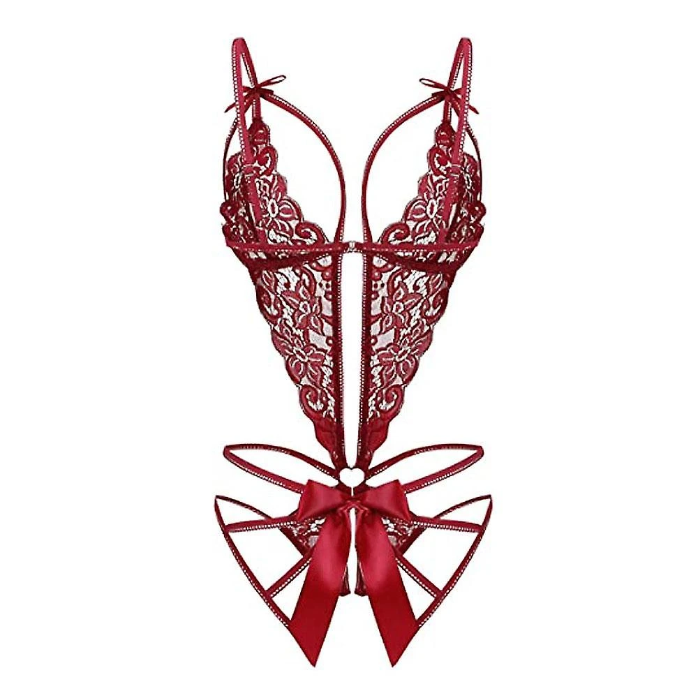 Women’s low-hanging lace teddy bear decorated with lace details, front lace decorated with bows, and cutouts at the bottom