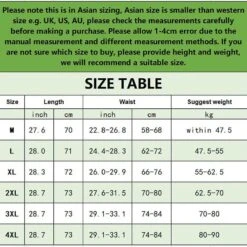 2XL: length 28.7 in/73 cm, waist 27.6-31.5 in/70-80 c