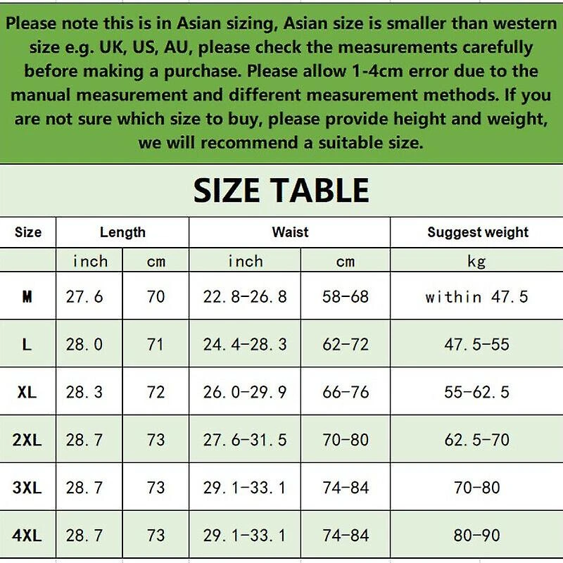 4XL: length 28.7 in/73 cm, waist 29.1-33.1 in/74-84 cm, suggest weight 80-90 kg